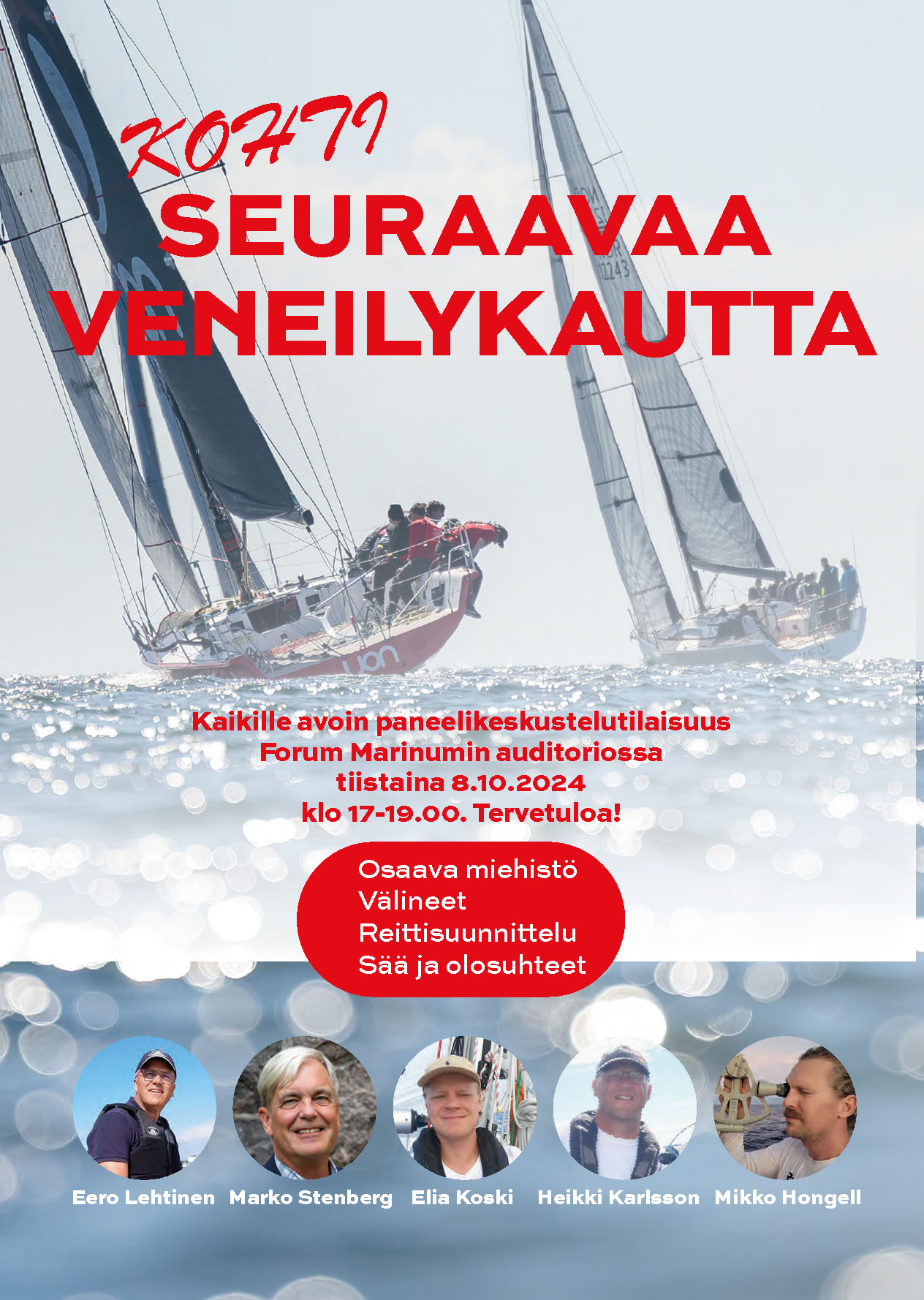 12.2. klo 18-20 Kilpapurjehdusilta TPS Purjehduskeskuksen Heikki Bang -salissa, aiheena säännöt, asiantuntijoina kansainväliset tuomarit Arto Kiiski ja Juhani Soini