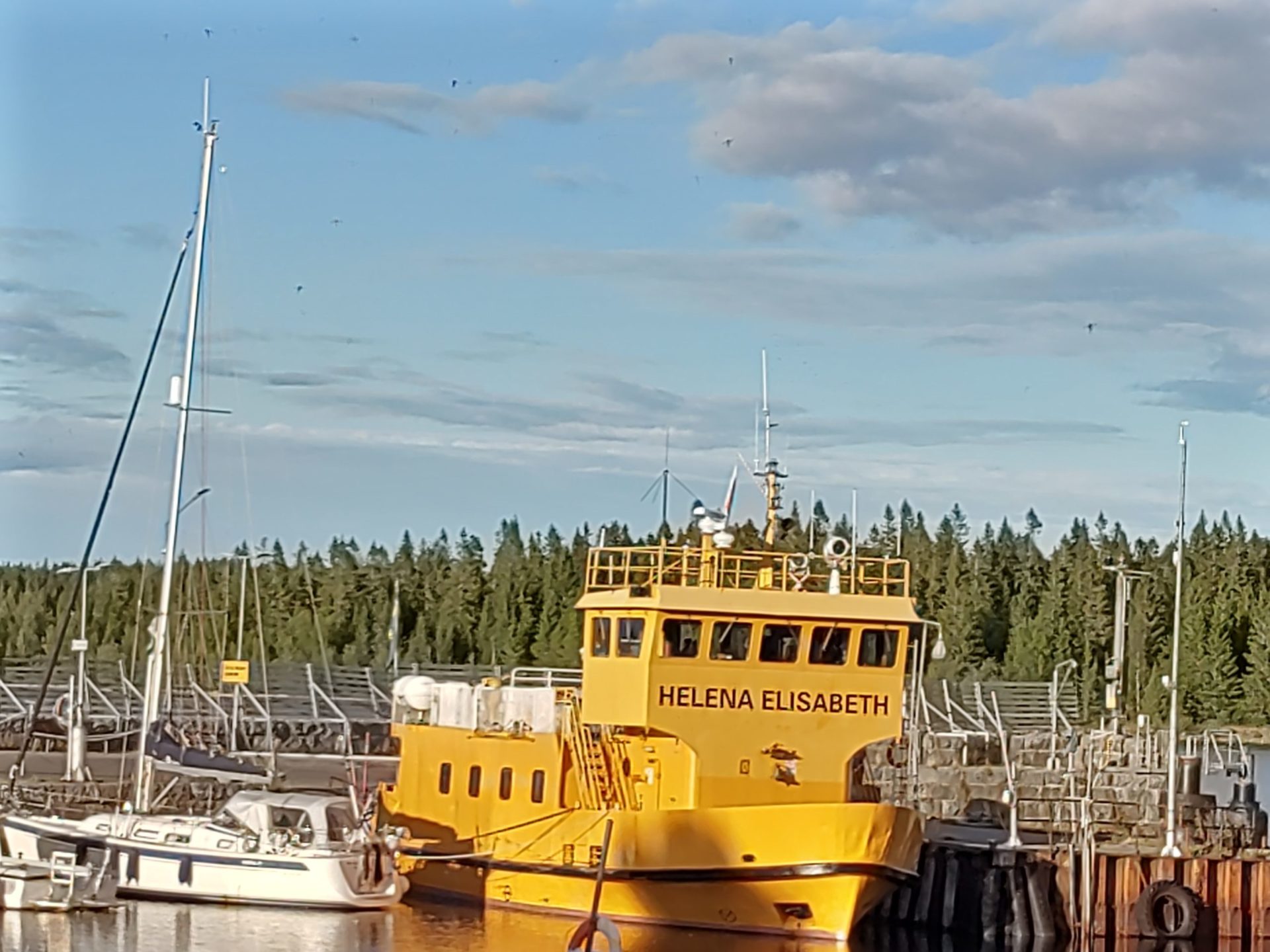 Bjuröklubbenissa tapaamamme mukavat ruotsalaisnuoret neuvoivat meitä ajamaan Holmön:ssä aallonmurtajalta oikealle (vieraspaikat vasemmalla) ja kiinnittymään käytöstä poistetun, keltaisen yhteysaluksen kylkeen. He varoittivat meitä siitä, että vierassatama on ahdas, ja madaltuu nopeasti poijujen takaa. Lisäksi yhteysaluksen potkurivirrat siirtävät mutaa paikasta toiseen.