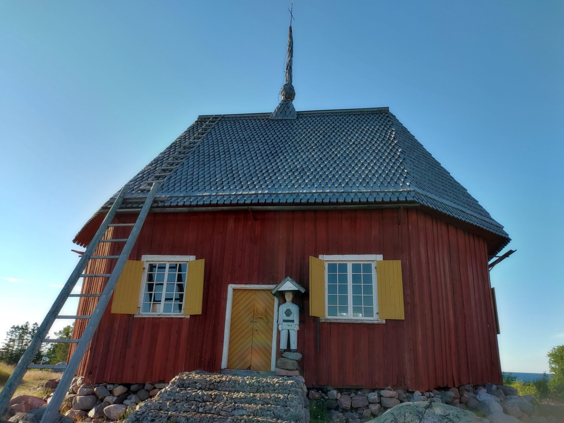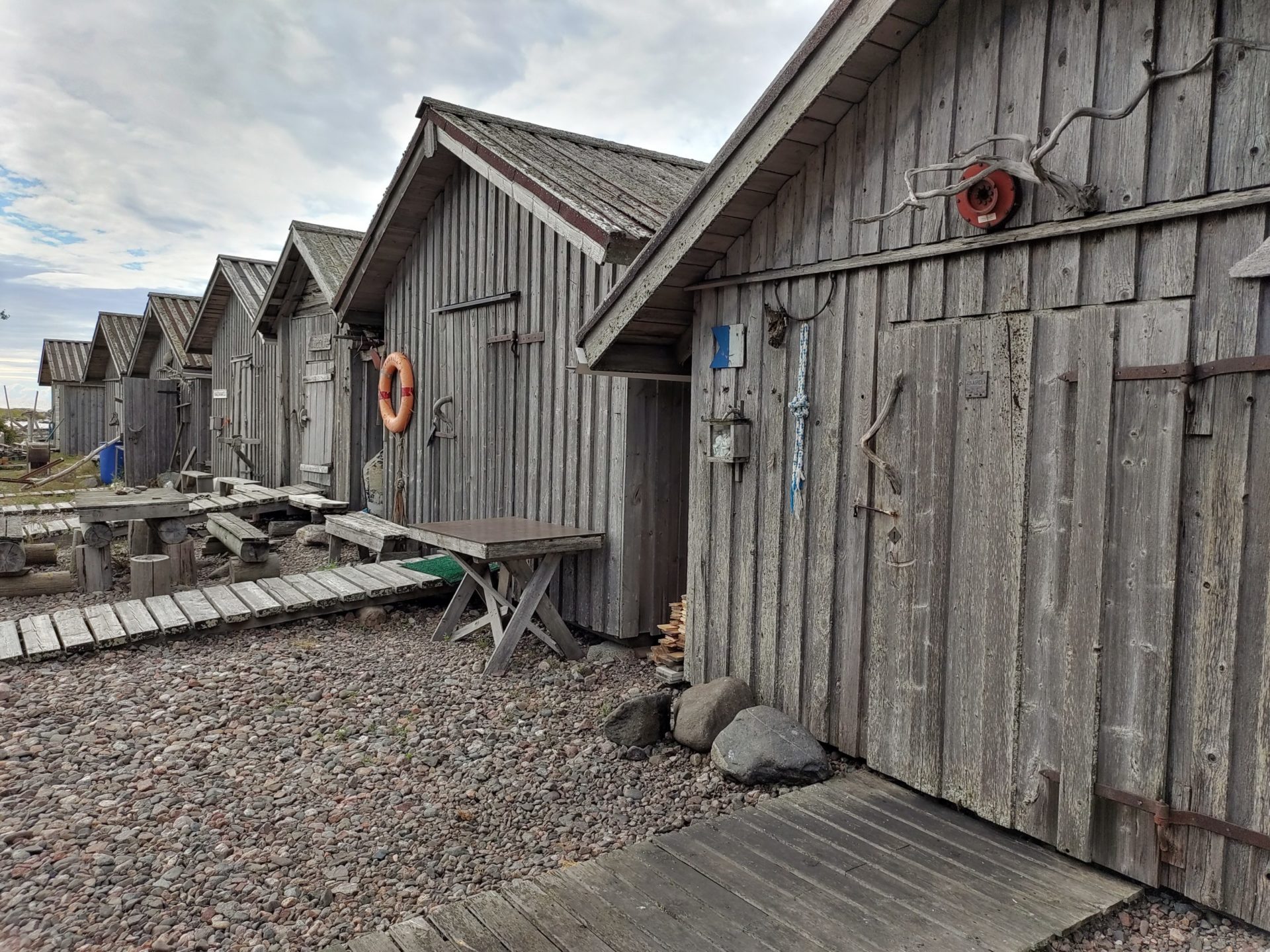 Kuva 14. Mukavien ruotsalaisnuorten veneet etualalla. Taustalla punainen sauna ‘kylpee’ auringossa.